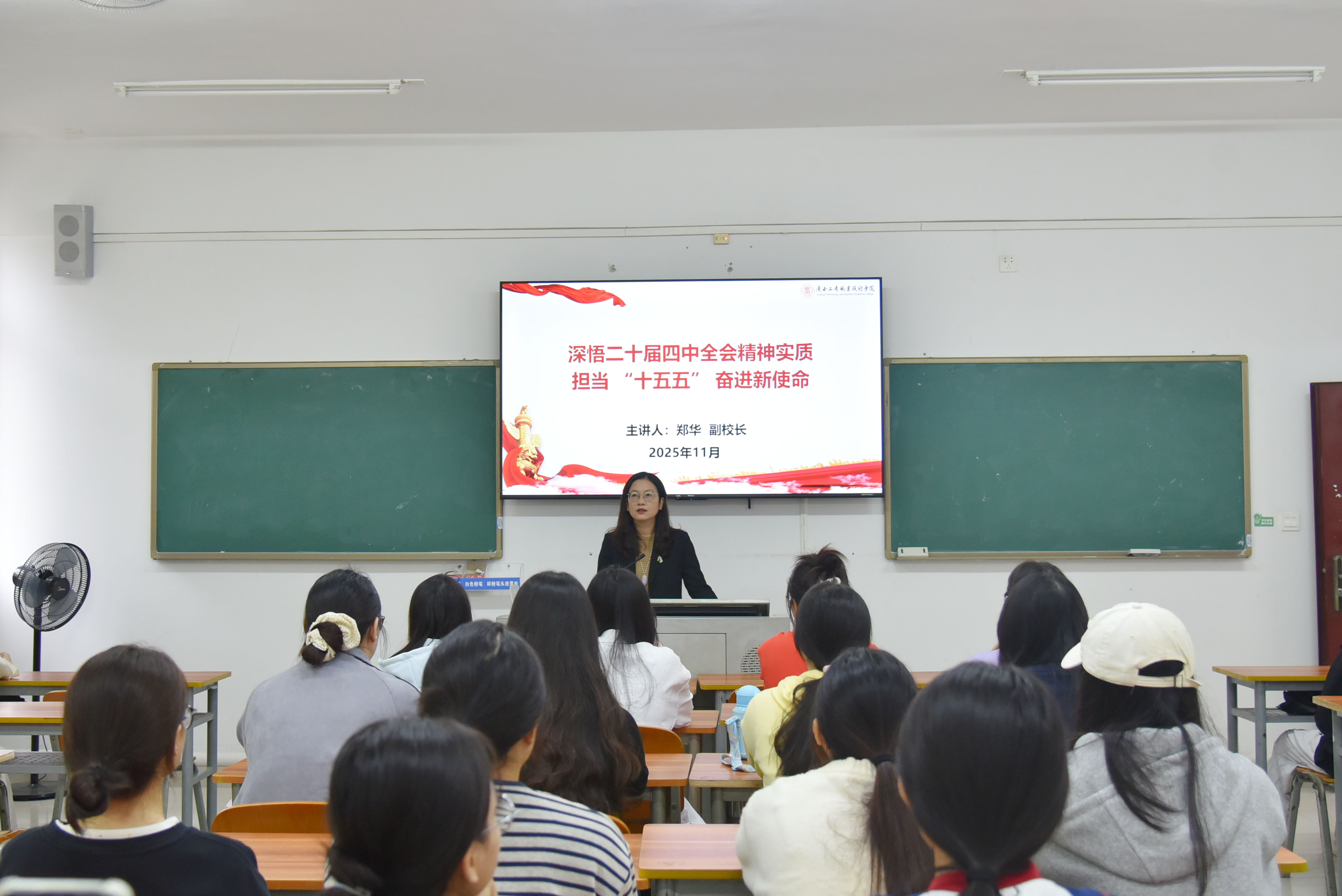 为深入学习贯彻党的二十届四中全会精神,提升思政课育人实效,2025年11月7日上午,学校副校长郑华以《深悟党的二十届四中全会精神实质 担当“十五五”奋进新使命》为主题,为视觉2402班同学讲授思政专题课。马克思主义学院部分教师现场听课。