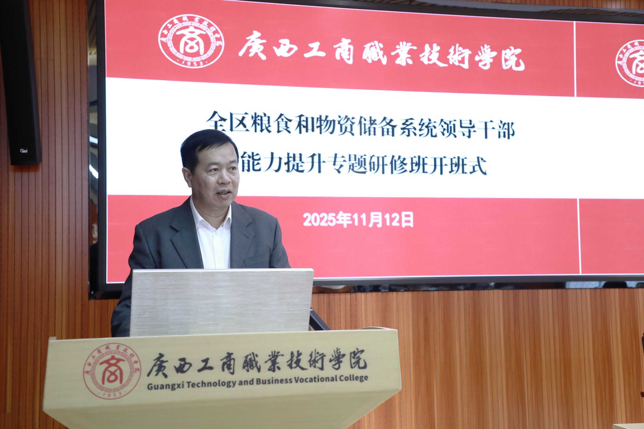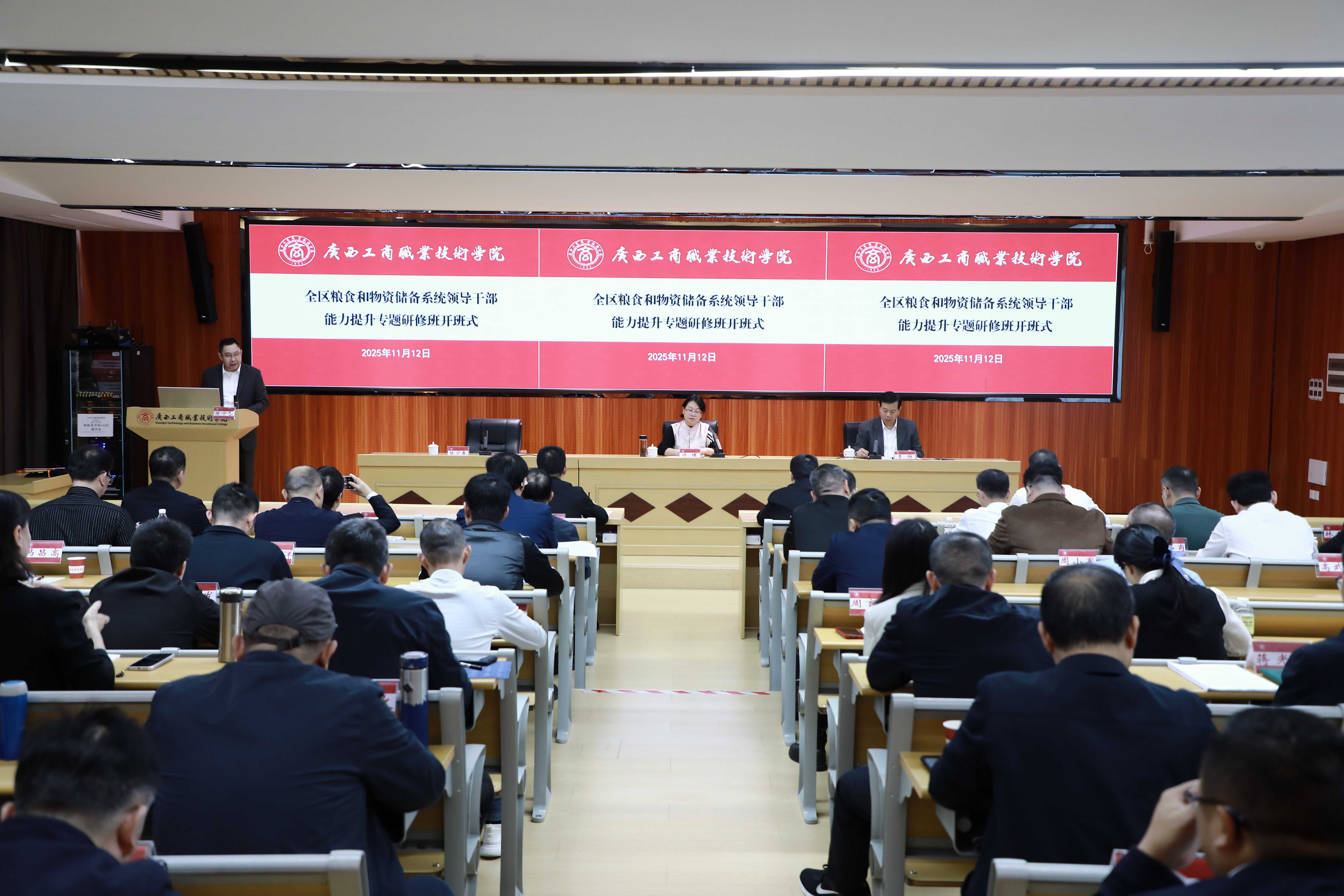 2025年11月12日,由我校承办的全区粮食和物资储备系统领导干部能力提升专题研修班顺利开班。自治区发展改革委党组成员,一级巡视员,自治区粮食和物资储备局党组书记、局长许瑾,广西工商职业技术学院党委书记李维出席开班式。学校副校长陈宁春主持开班式。本次研修班参训人员共计70余人,培训对象涵盖局领导、各市(含部分县、区)粮食和储备局主要领导及业务科室负责人、局机关处室负责人和业务骨干、直属单位(含储备粮集团子公司)负责人和业务分管领导。