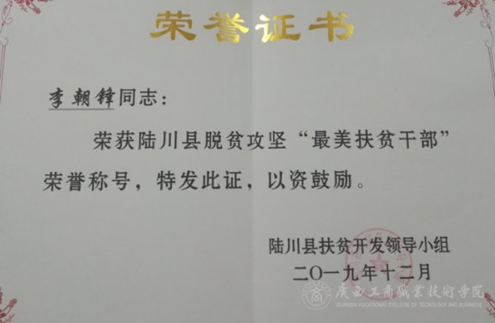 近日,陆川县扶贫开发领导小组印发《关于表扬2019年度陆川县脱贫攻坚“六个最美”先进典型的通知》,对苏海琪等64名陆川县脱贫攻坚(乡村振兴)工作队员予以通报表扬,评选出10名“最美第一书记”,10名“最美工作队员”,10名“最美扶贫干部”,14名“最美扶贫村支书”,10名“最美脱贫户”,10名“最美致富带头人”。我院第一书记李朝锋、刘洋在全县众多脱贫攻坚(乡村振兴)工作队员中脱颖而出,分别喜获“最美扶贫干部”、“最美第一书记”荣誉称号!