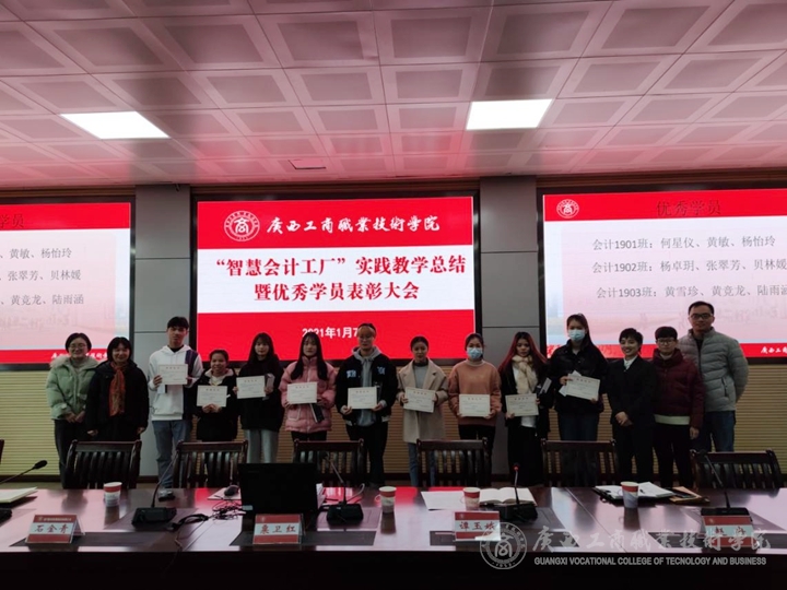 2021年1月7日下午,广西工商职业技术学院会计学院在鹏飞校区2119会议室召开了“智慧会计工厂”实践教学总结暨优秀学员表彰大会。会计学院粟卫红院长、教学负责人谭玉娥、南宁橙米商务服务有限公司石金青经理、教研室相关教师及2019级会计专业学生代表参加了会议。