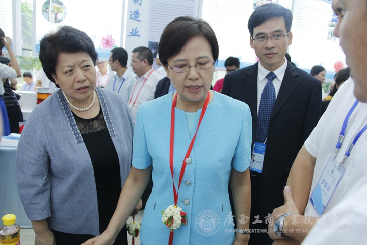 教育部副部长鲁昕、广西副主席李康等领导观看了我院的食品检测展示台。在我院广告设计展示处,鲁昕副部长与2015年获全国高职市场营销职业技能竞赛团体奖一等奖的成员之一陈铺娟亲切交流,陈铺娟同学向鲁昕副部长简单介绍了我院的职业教育展示特色,鲁昕副部长表扬陈铺娟是个优秀的学生,并一同合影留念。