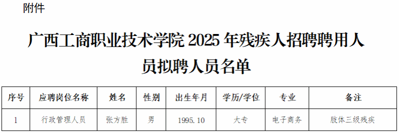 根据《广西壮族自治区机关、事业单位、国有企业带头安排残疾人就业实施办法》(桂残联字〔2022〕15号)及有关文件精神,结合本单位实际工作需要,我校在中国残疾人就业创业网络服务平台发布残疾人招聘岗位信息。经报名、资格审查、综合考核、思想政治素质考核、体检等程序,经研究,拟聘用张方胜同志到我校工作,现将拟聘人员予以公示,公示期为7日(2025年10月23日至2025年10月29日)。公示期内如对拟聘人员有异议,请以书面形式,并署真实姓名、联系方式及联系地址,于2025年10月29日18时前寄送到广西工商职业技术学院人事处(直接送达以送达日期为准,邮寄以寄出邮戳为准)。地址:广西南宁市鹏飞路15号广西工商职业技术学院人事处(2415办公室);联系人:周老师、李老师;邮编:530008;电话:0771-3160065。如实反映拟聘用人员的有关问题受法律保护。
