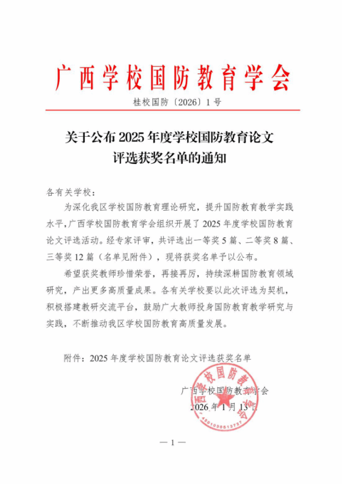近日,广西学校国防教育学会公布了2025年度学校国防教育论文评选结果,我校教师孙晓宇凭借论文《兵棋游戏融入高职军事理论教学研究——以广西工商职业技术学院为例》荣获一等奖,张宇斐、廖显图老师的论文《新时代高校国防动员能力生成路径探析——从知识储备到行动转化的协同创新》获三等奖。这一成绩充分展现了我校在国防教育领域的创新实践与理论研究实力,为推动全区国防教育高质量发展提供了宝贵经验。
