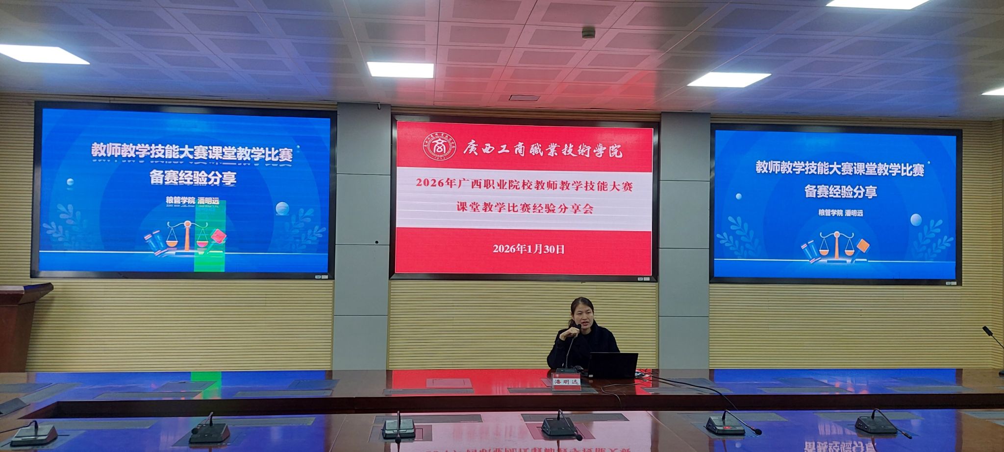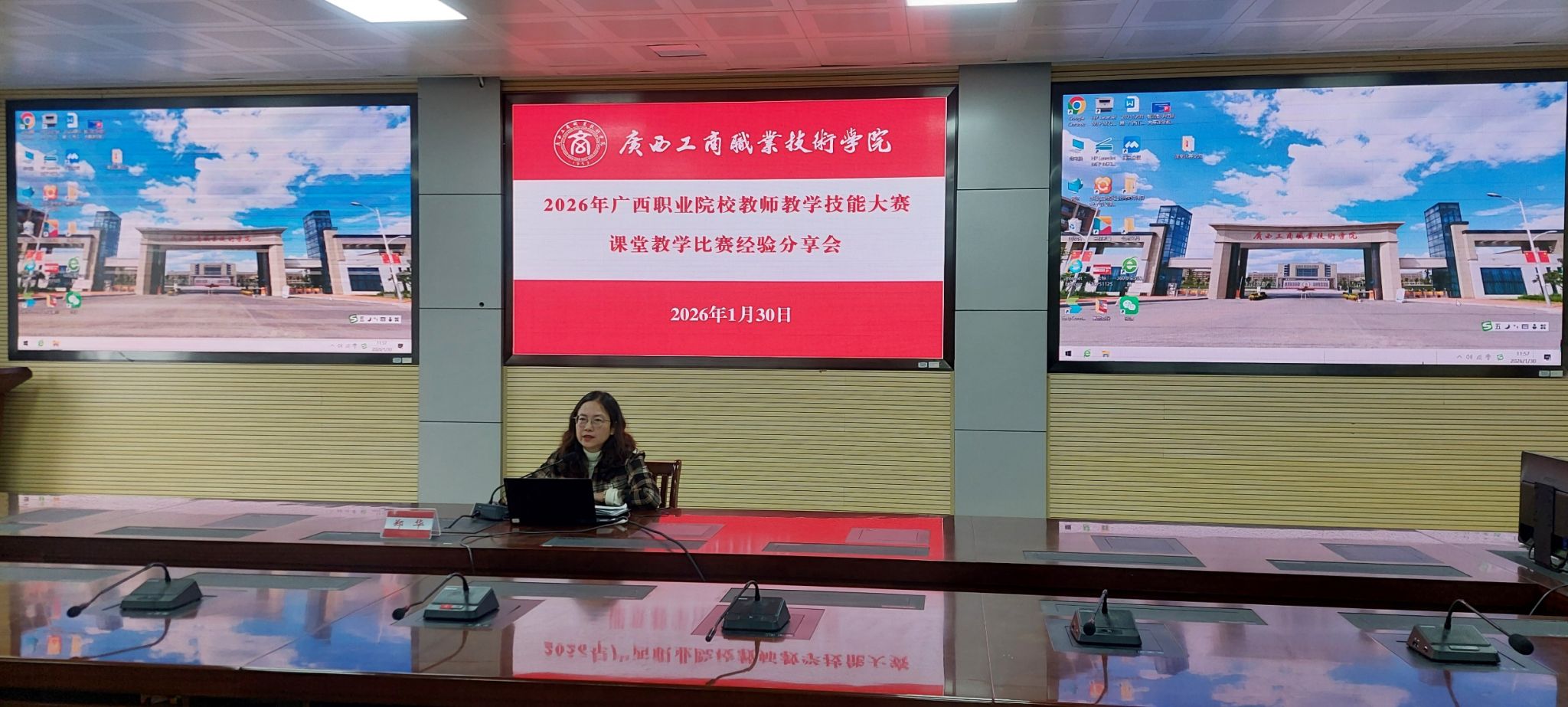 为扎实推进2026年广西职业院校教师教学技能大赛课堂教学比赛备赛工作,全面提升参赛作品质量与教师教学核心能力,2026年1月30日上午,我校在鹏飞校区召开经验分享会。学校副校长郑华,教务处、各二级学院主要领导,参赛团队全体成员,以及各二级学院骨干教师代表参加了会议。