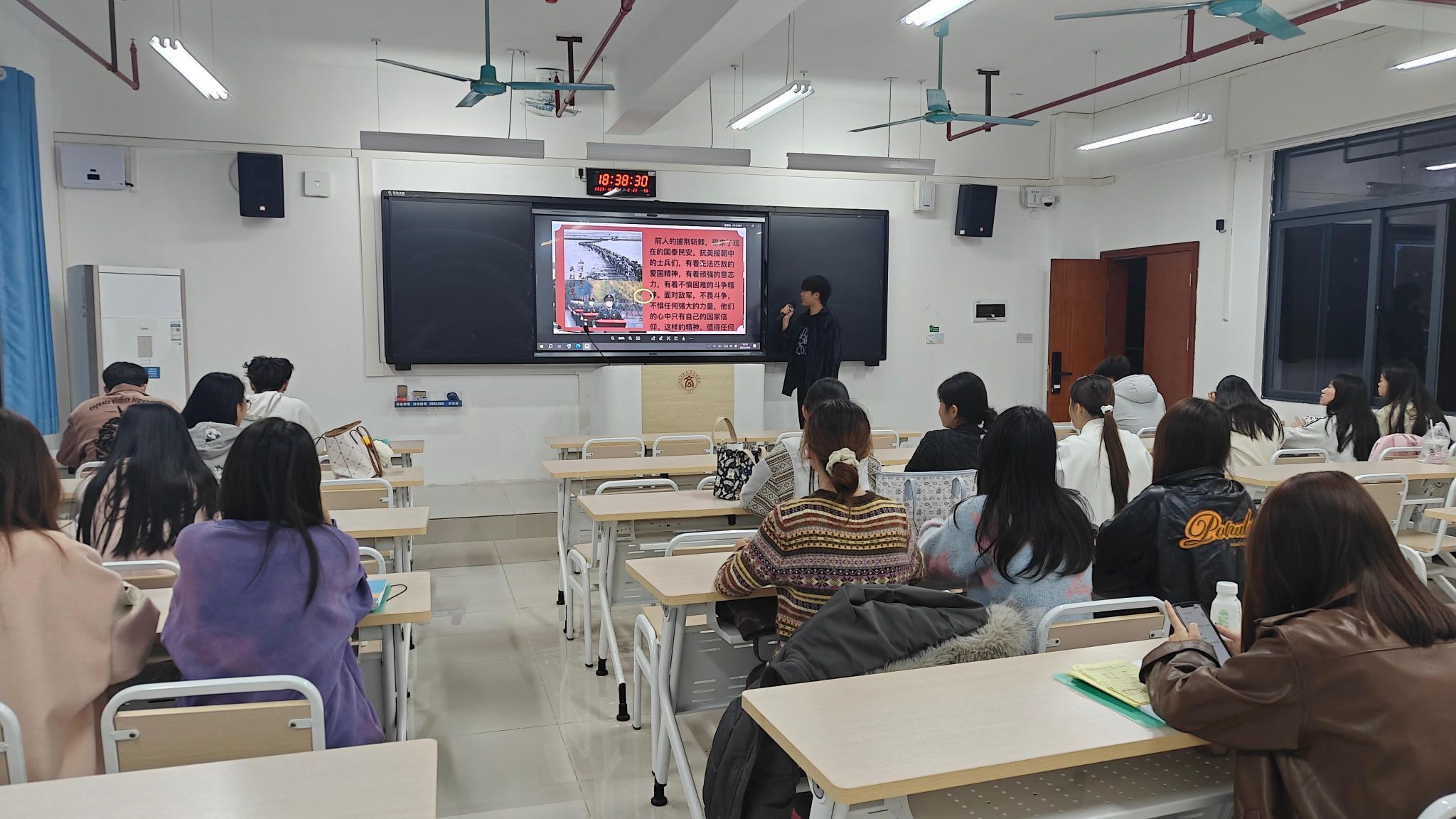 活动中,朋辈宣讲员结合抗美援朝历史背景与英雄事迹,通过PPT展示、短视频播放、故事分享等形式,生动诠释“祖国和人民利益高于一切”的抗美援朝精神。他们讲述黄继光舍身堵枪眼、邱少云严守潜伏纪律等感人故事,还结合自身成长经历,分享如何在学习生活中践行精神——比如带头刻苦钻研专业知识、主动参与校园志愿服务。互动环节中,班级同学积极提问,围绕“新时代青年如何传承抗美援朝精神”展开热烈讨论,现场氛围浓厚。