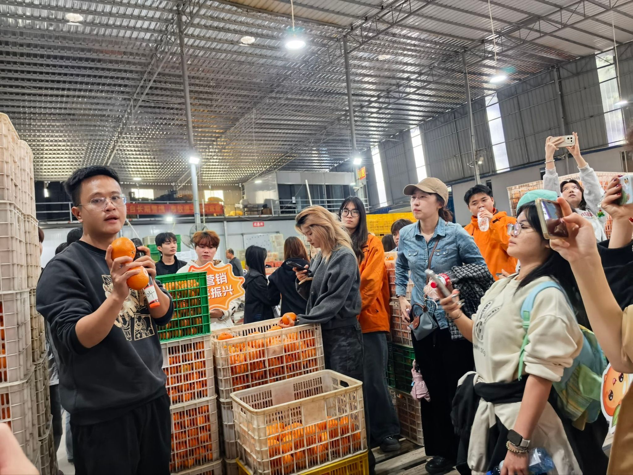 师生一行先后走访了鑫天兰农业有限公司果园基地与广西鸣鸣果业有限公司果园基地,实地考察沃柑种植环境、采摘流程与品控体系。企业负责人详细介绍了沃柑的品种特点、种植技术与品牌发展历程,并带领师生深入果园和供应链工厂,讲解果品分级、包装与供应链运作模式。学生们结合专业学习需求,重点围绕目标客群、产品卖点、品牌打造、市场推广等内容展开实地访谈与素材采集,为后续撰写市场调研报告、创作推广内容积累了一手资料。